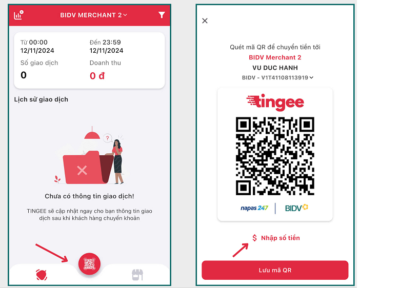Mở app Tingee -> Nhấp vào biểu tượng mã QR -> Điền số tiền và nội dung